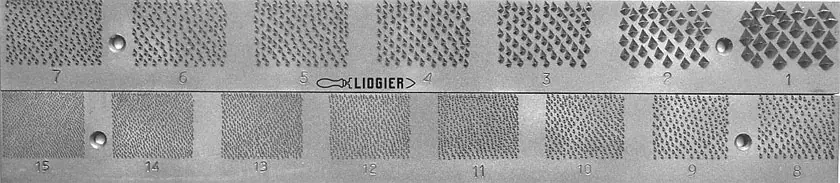 I denti delle raspe Liogier sono numerati da n. 1 a n. 15, dove n. 1 è il più grosso e n. 15 è il più fine. Le raspe a righe sono disponibili con i denti da 8 a 15, con i denti da 11 a 13 che sono i più comuni in pratica.